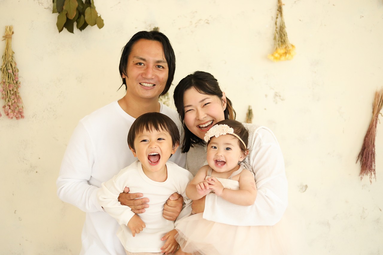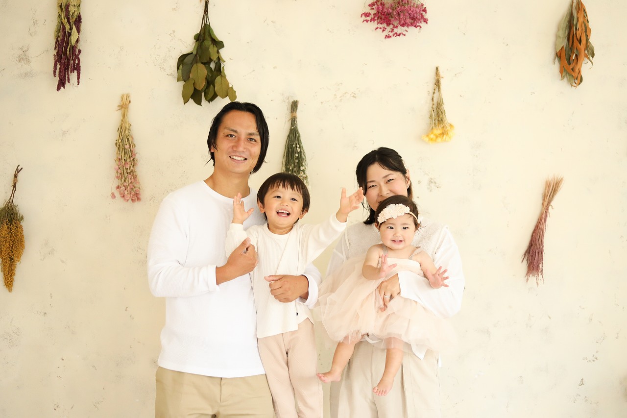 スタジオメインのドライフラワー壁の前で家族写真。