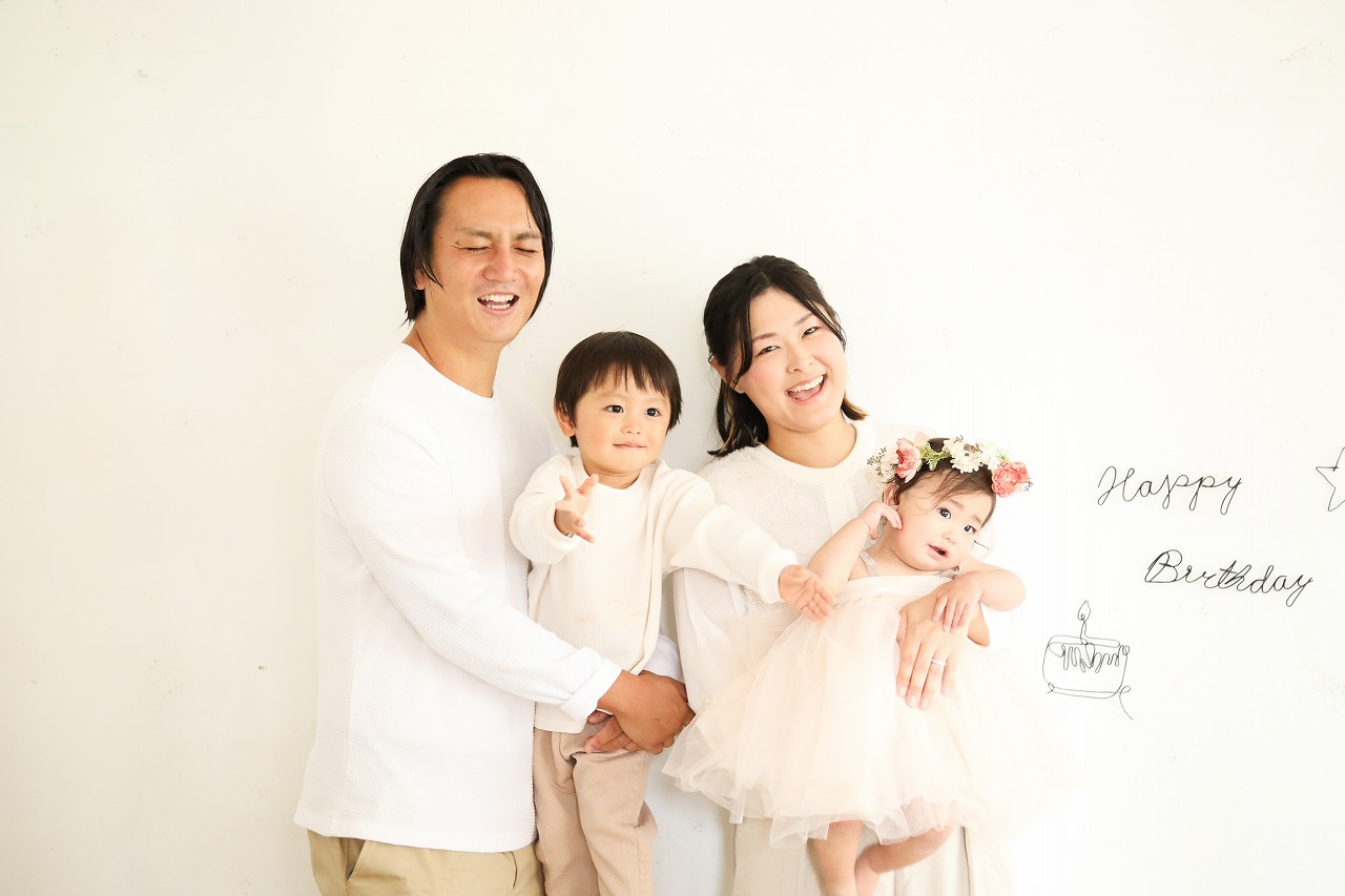 ハッピーバースデーのオブジェとともに家族写真。