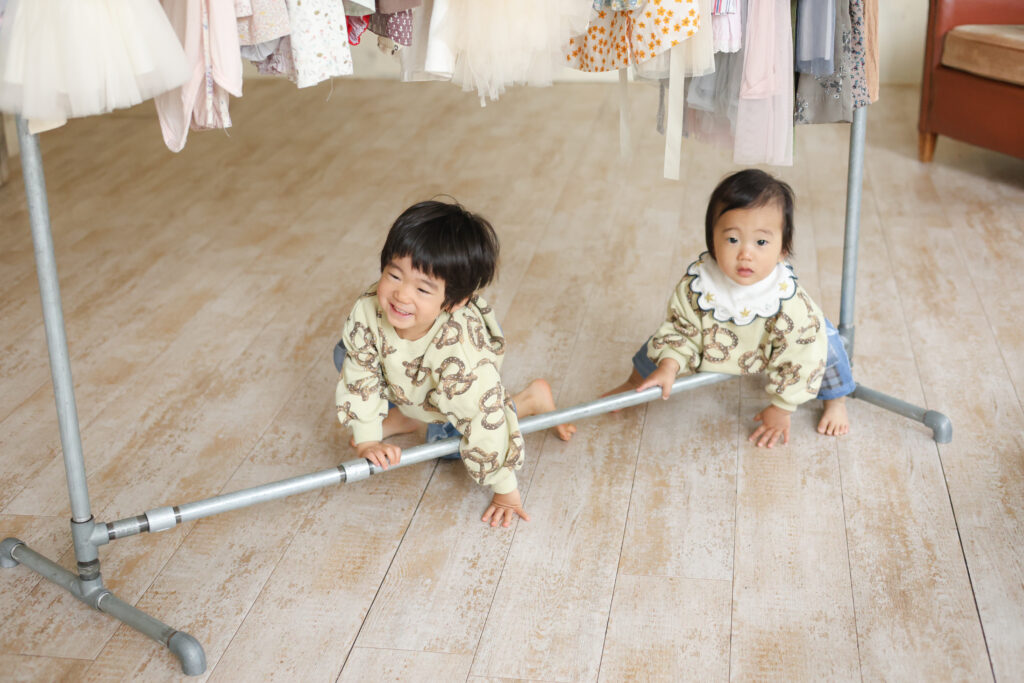お衣装を決めている間に、衣装をかけているポールでふたりが遊んでいたので激写。