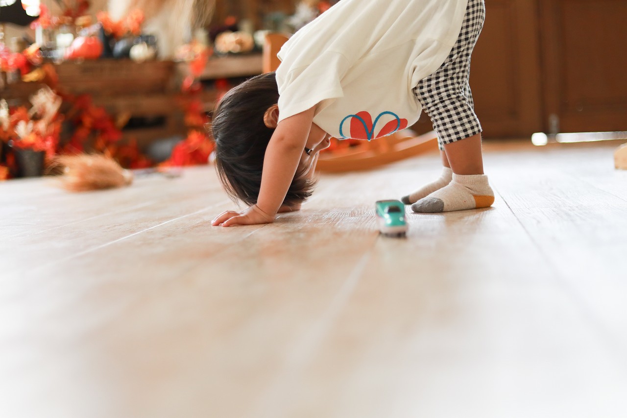 電車や車が大好きで、撮影そっちのけで夢中で遊びます。