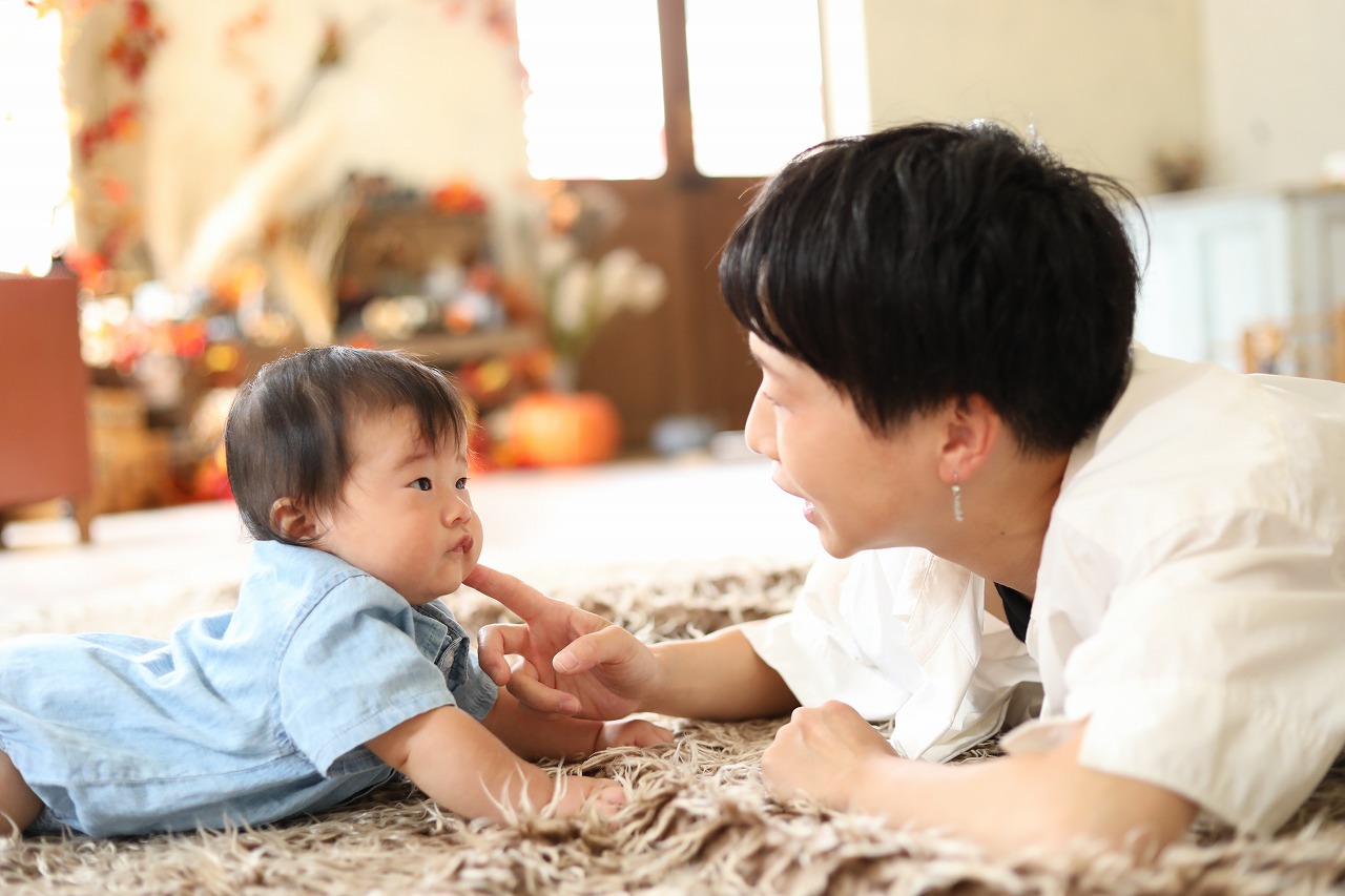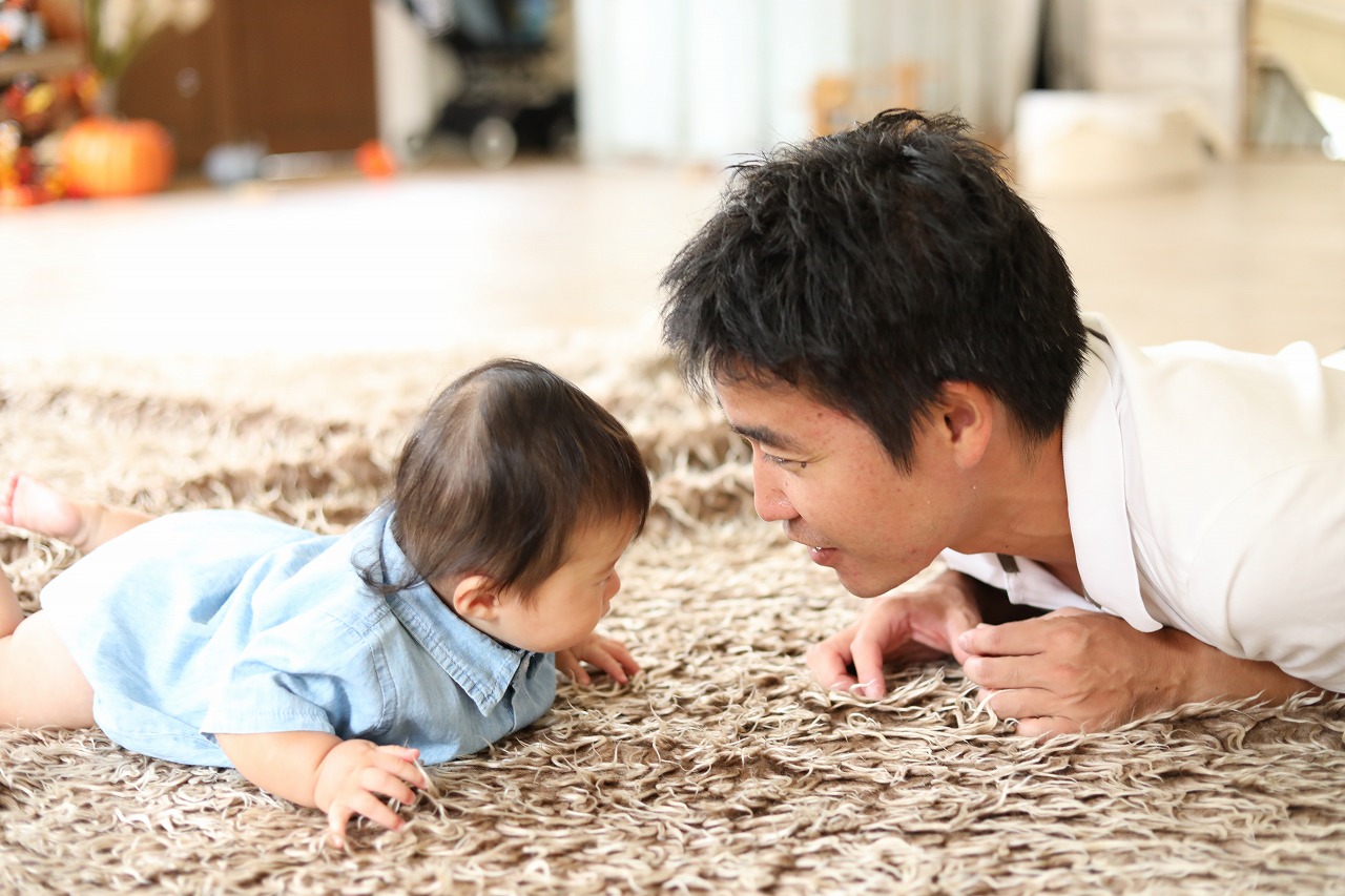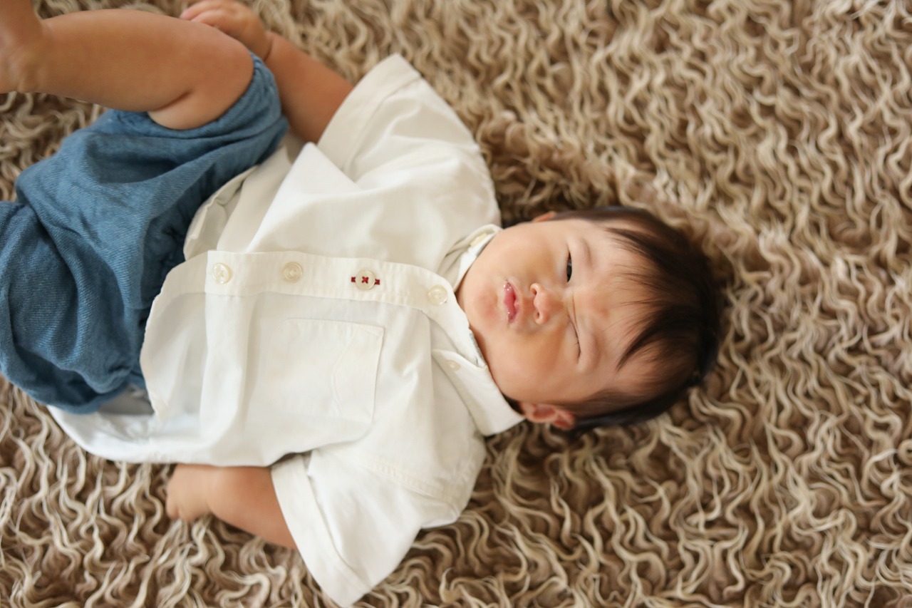 仰向けねんねでご主役ピンショット!アシスタントの増川お兄さんのおかげでニコニコです