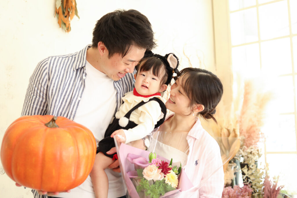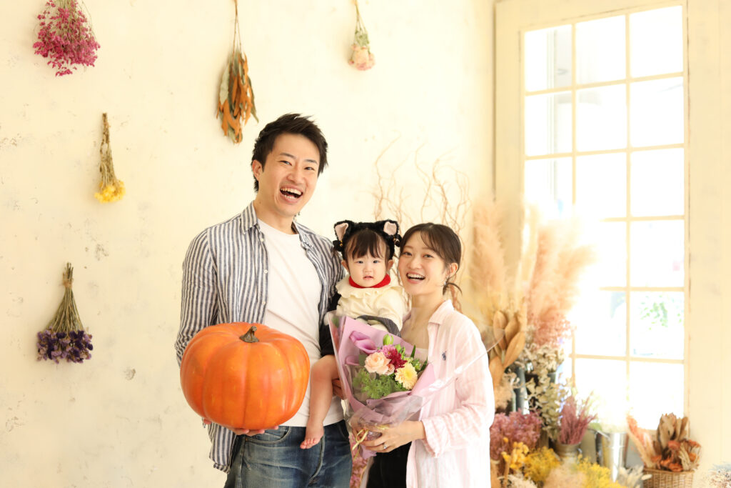 プレゼントのお花より、カボチャの存在感が気になるものの、ステキすぎる家族写真!