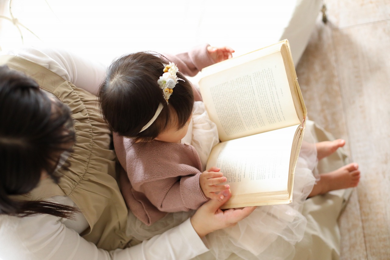 ママの膝の上に座って、本を読んでる?