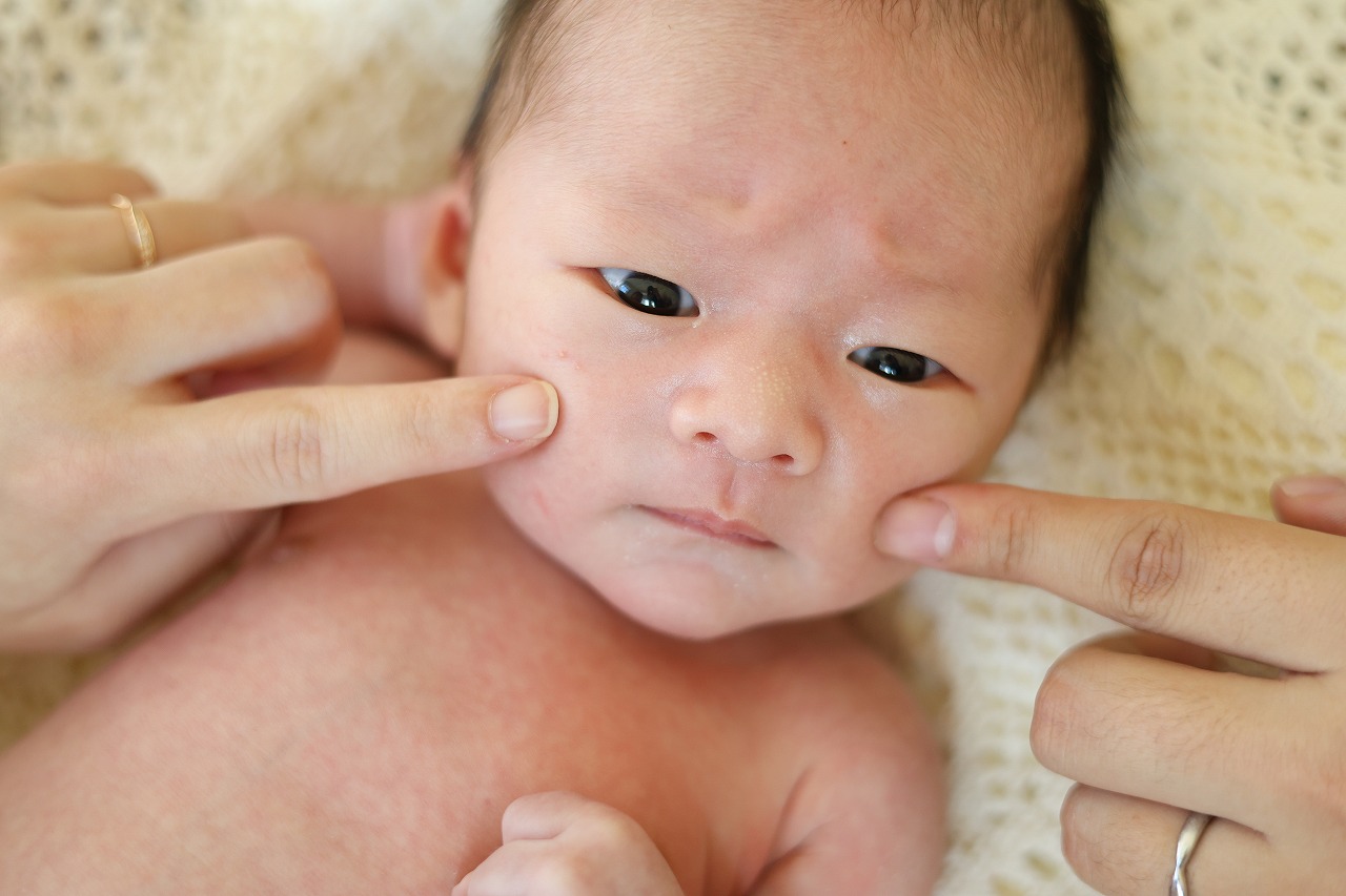 パパママにほっぺつんつんされてる図。怒ってる?笑