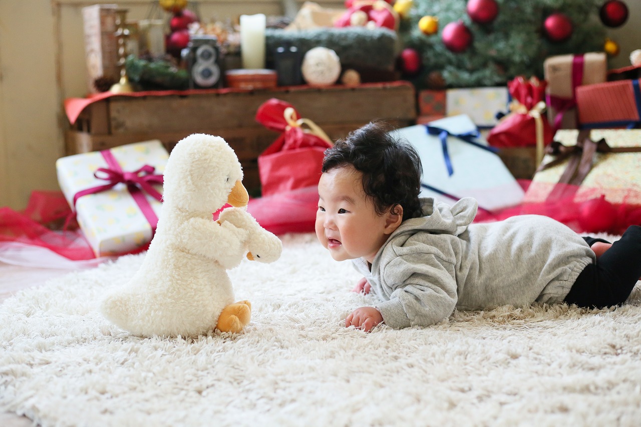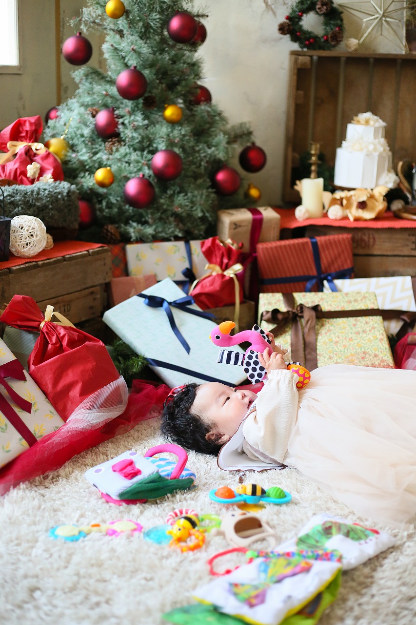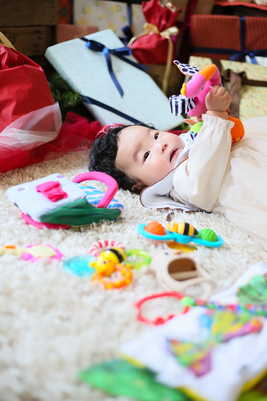 クリスマスプレゼントを開けて、オモチャで遊んでいるみたい