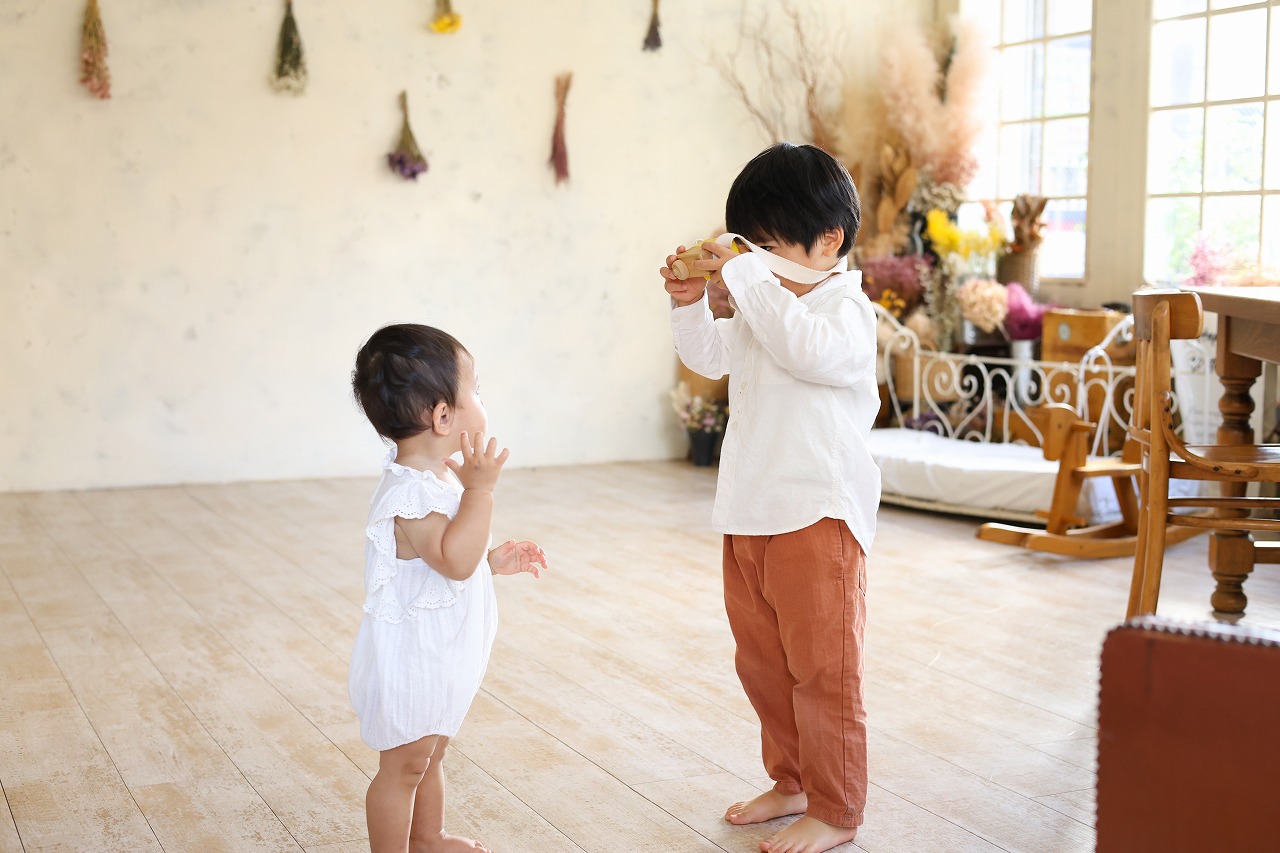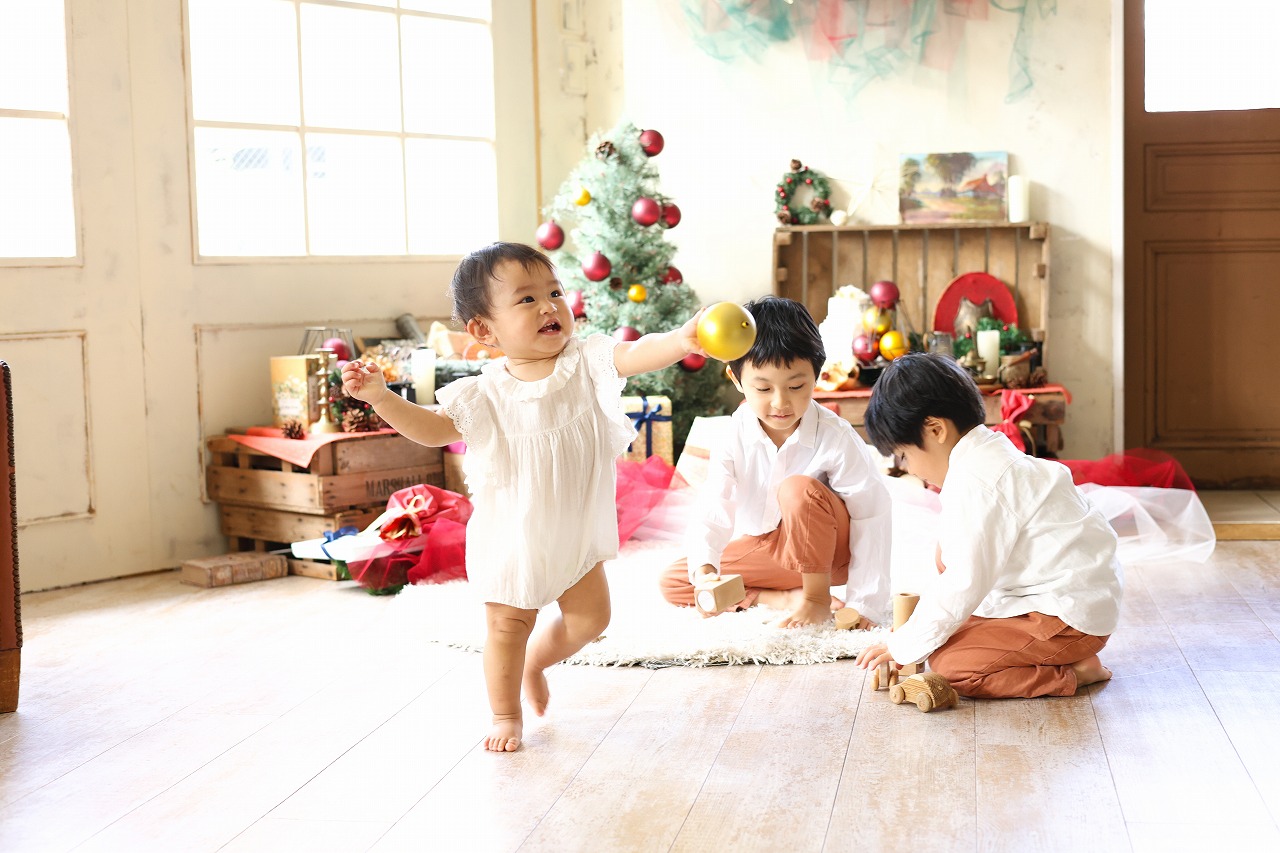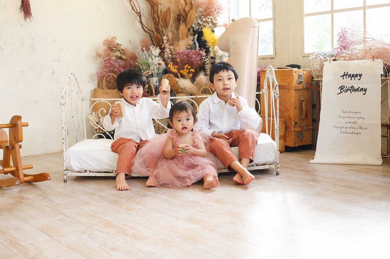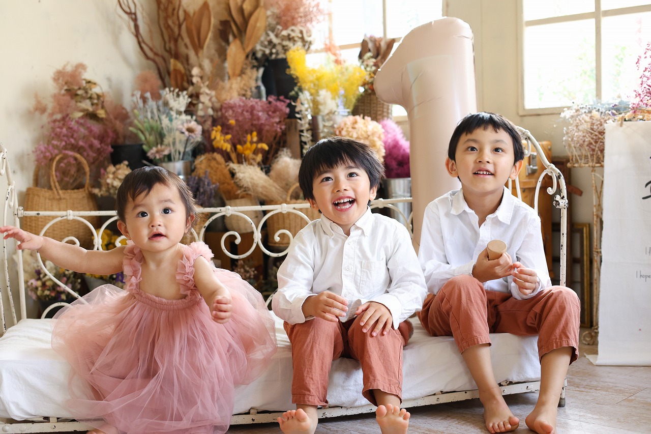 <1才バースデー>3兄妹は元気いっぱい<兄弟写真>