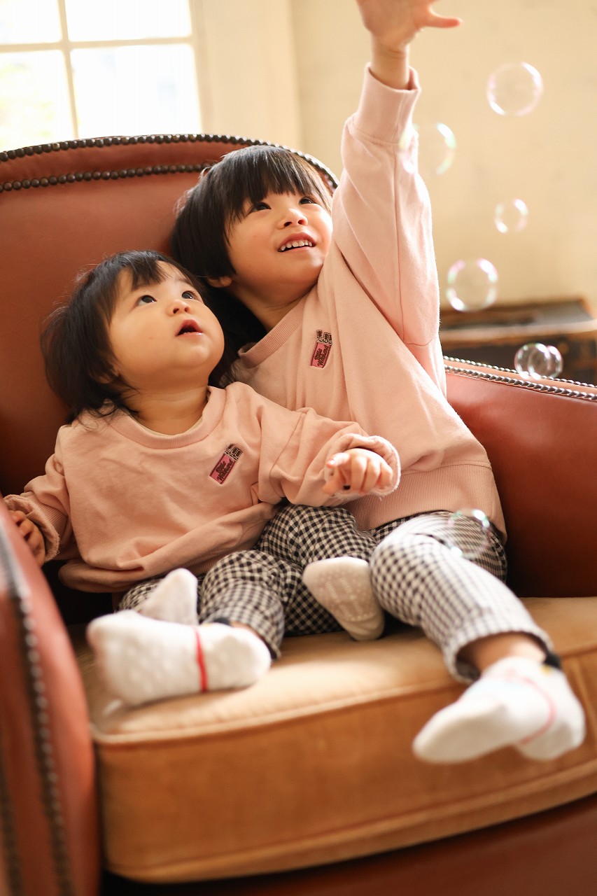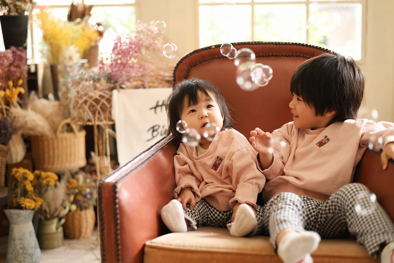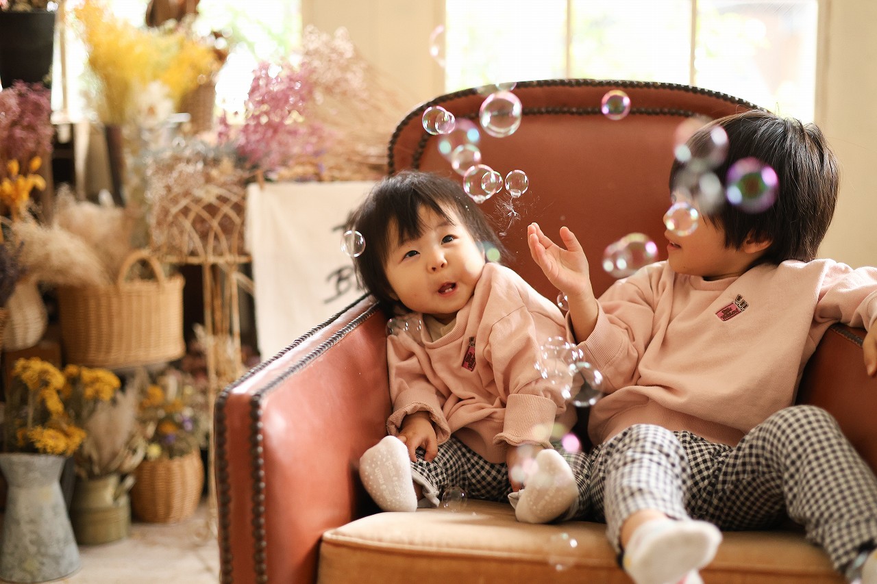シャボン玉の力を借りて、再度兄妹写真。