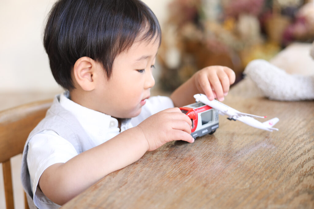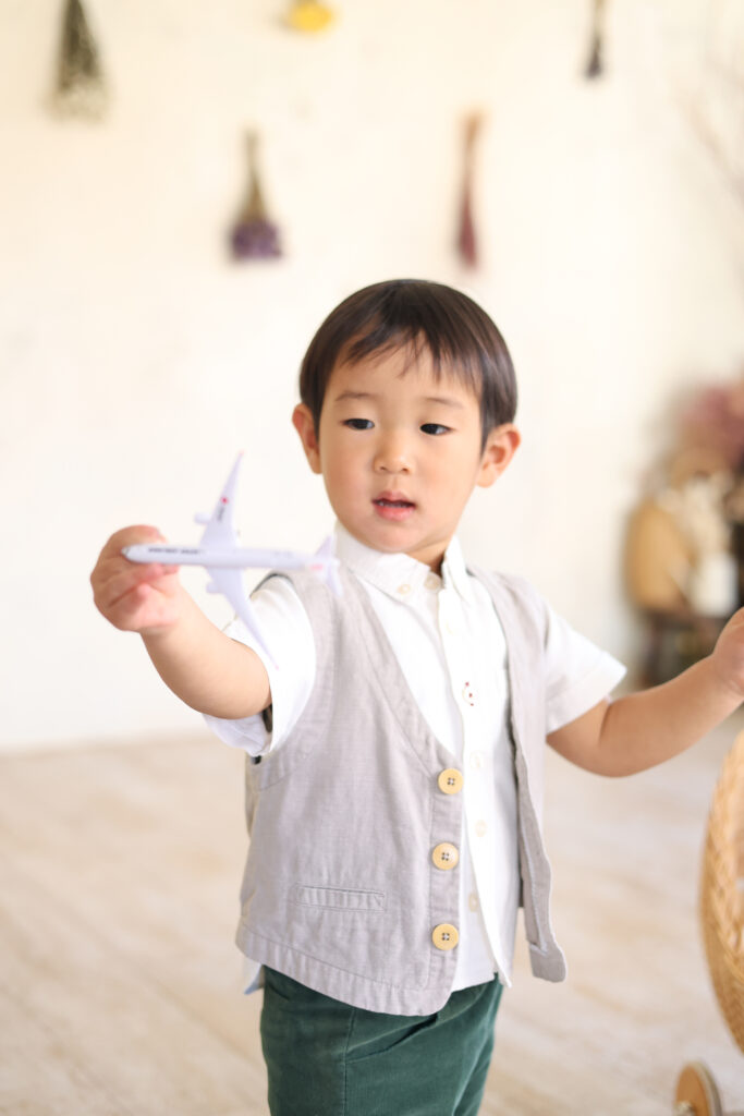 家から持ってきた飛行機で遊ぶ真剣な姿。