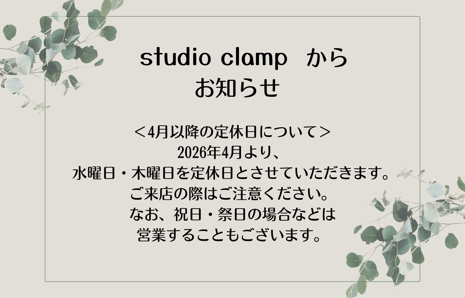 このたび、2026年4月より定休日を変更させていただくこととなりました。