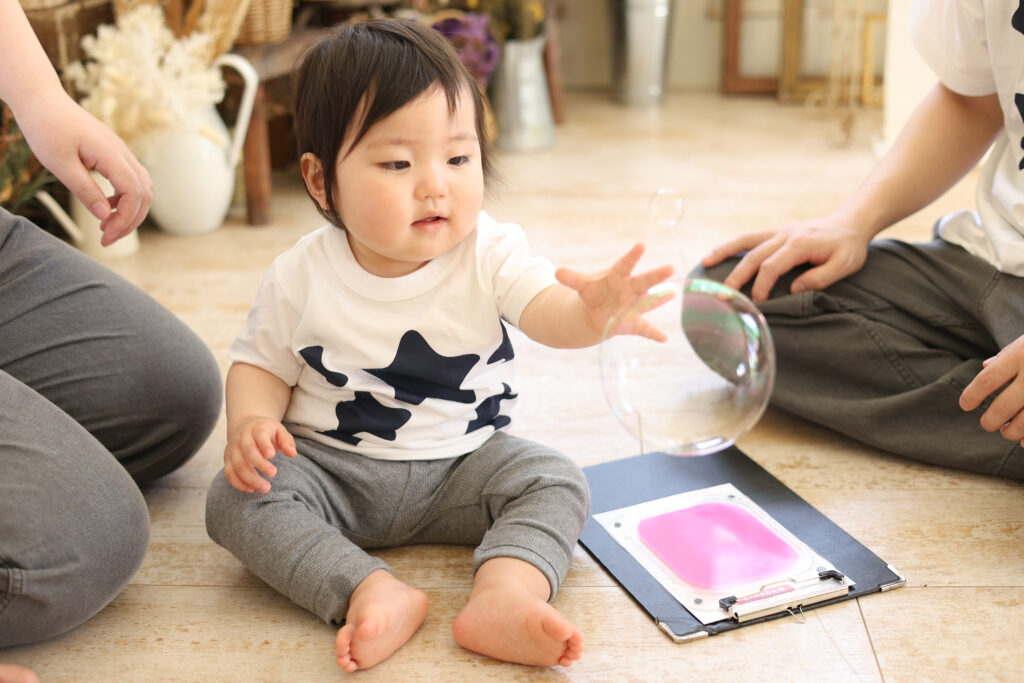がんばったね~とパパとママにたくさんほめてもらって、最後は大好きなシャボン玉を見て上機嫌♪