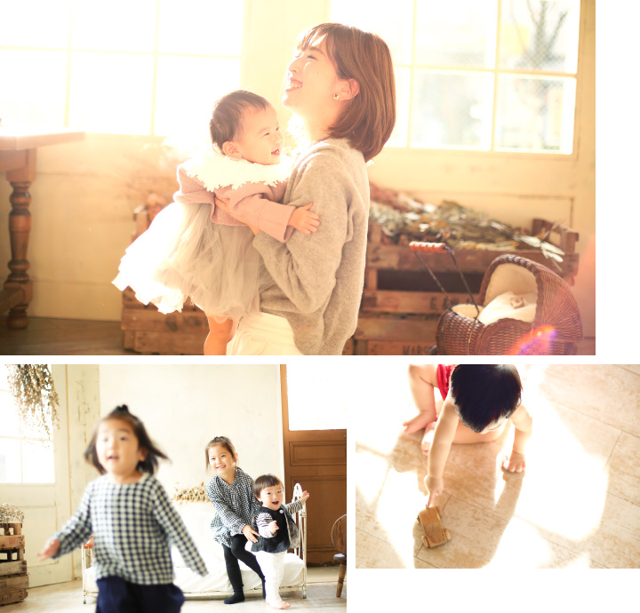 ご機嫌が悪い場合、授乳など休憩しながらゆっくり撮影します。また、赤ちゃんに安心してハイハイしてほしいので、スタジオ内は土足厳禁。