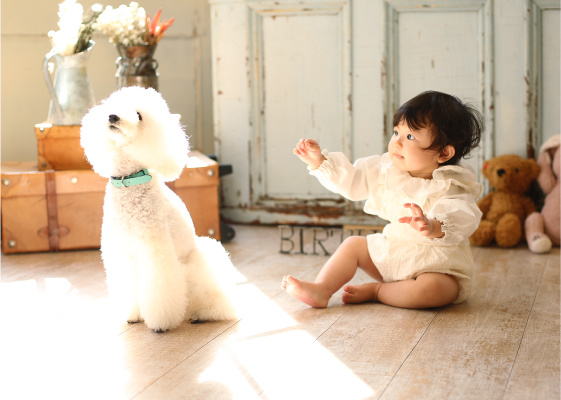 自然光と相性の良い、ドライフラワーとアンティーク家具でスタイリング。ヨーロッパから仕入れた本物のアンティーク家具は、写真に深みと奥行きを与えます。スタジオの世界観に合うお洋服もご用意しております。(0~4才くらいまで)