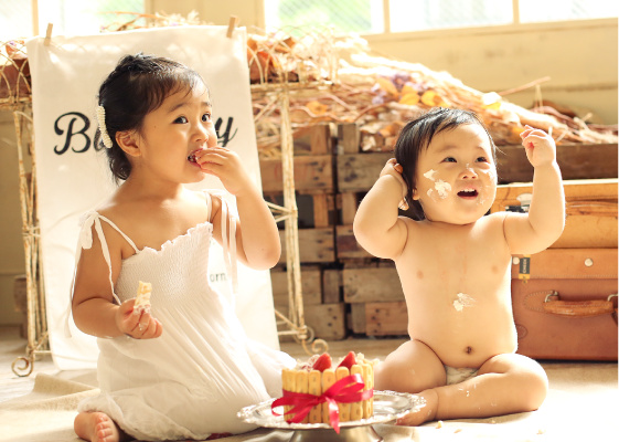 ケーキスマッシュが撮影出来る珍しい写真館です。当店の半数以上のお客様がスマッシュをご希望されます。